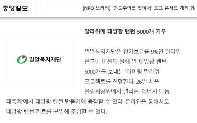 [중앙일보] 말라위에 태양광 랜턴 5000개 기부 外