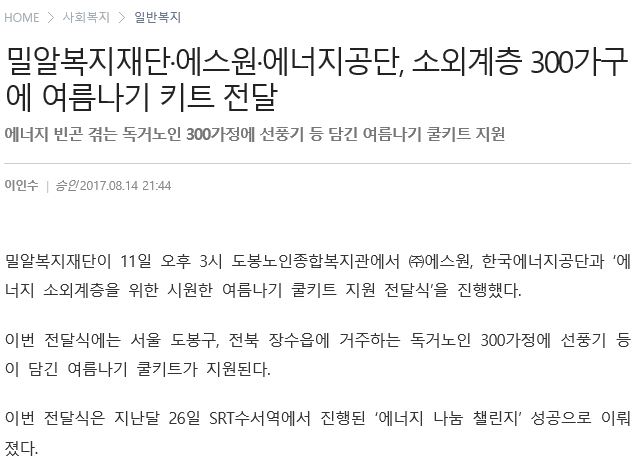 [복지연합신문] 밀알복지재단·에스원·에너지공단, 소외계층 300가구에 여름나기 키트 전달