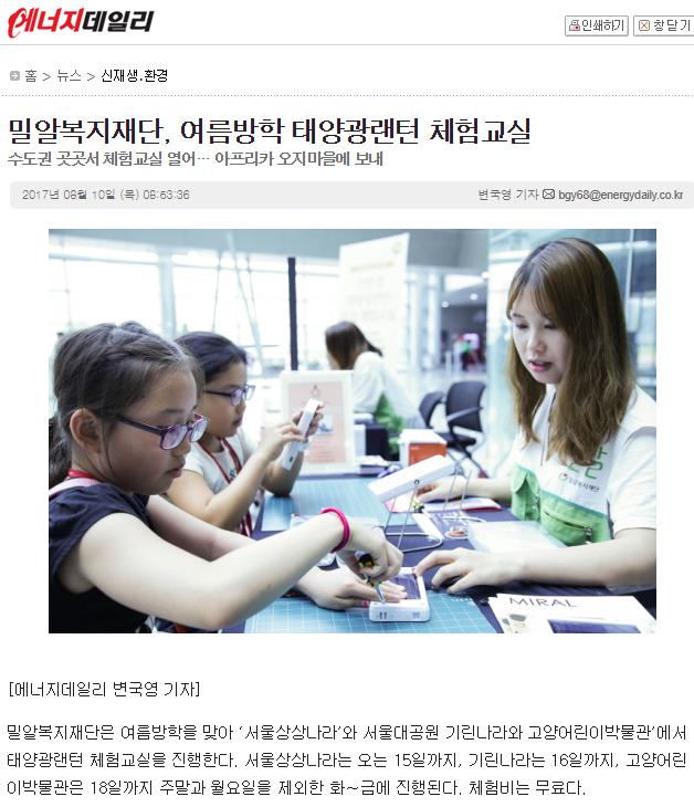 [에너지데일리] 밀알복지재단, 여름방학 태양광랜턴 체험교실