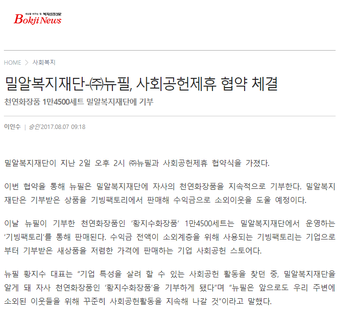 [복지연합신문] 밀알복지재단-㈜뉴필, 사회공헌제휴 협약 체결