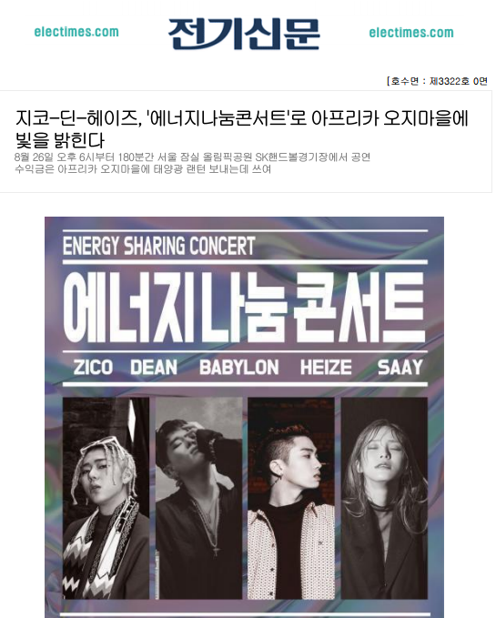 [전기신문] 지코-딘-헤이즈, '에너지나눔콘서트'로 아프리카 오지마을에 빛을 밝힌다