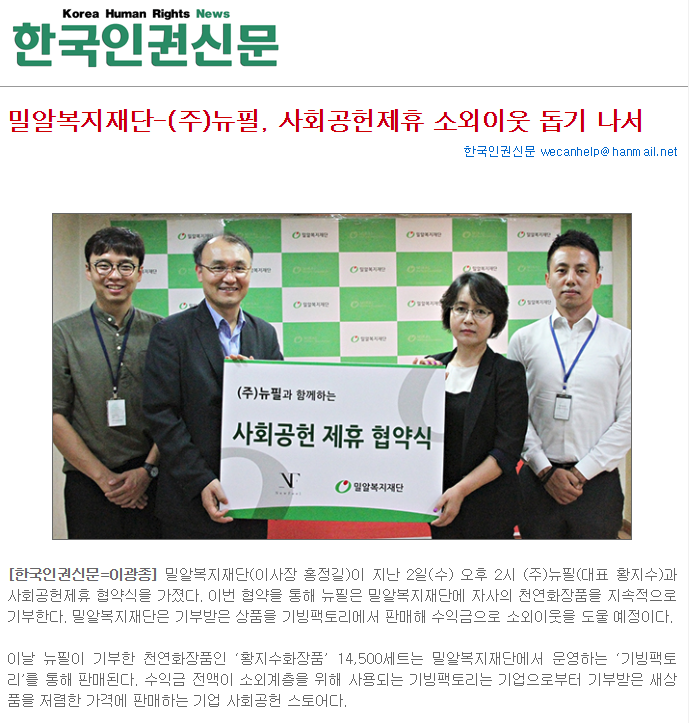 [한국인권신문] 밀알복지재단-(주)뉴필, 사회공헌제휴 소외이웃 돕기 나서