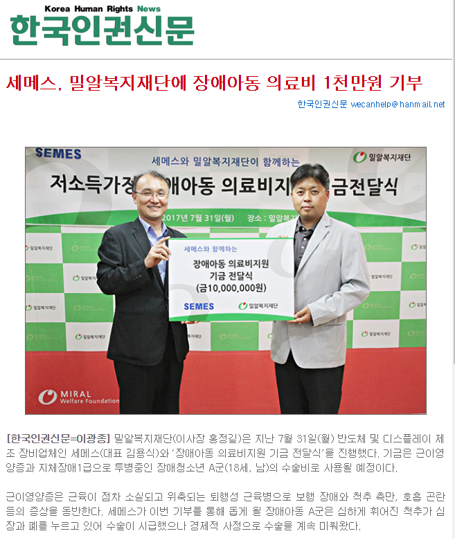 [한국인권신문] 세메스, 밀알복지재단에 장애아동 의료비 1천만원 기부