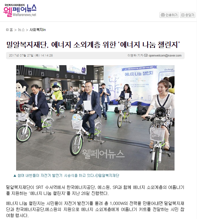 [웰페어뉴스] 밀알복지재단, 에너지 소외계층 위한 ‘에너지 나눔 챌린지’