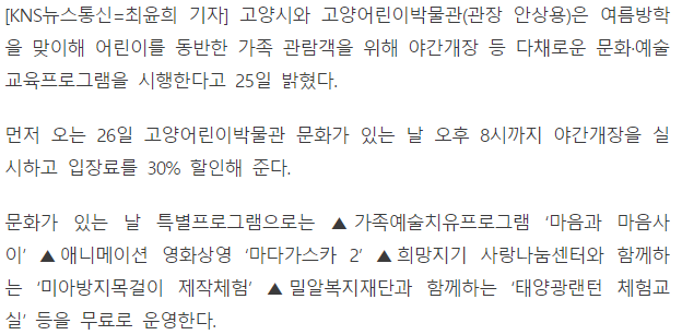 [KNS뉴스통신] 고양어린이박물관, 여름방학 프로그램 '풍성'
