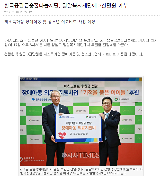 [시사타임즈] 한국증권금융꿈나눔재단, 밀알복지재단에 3천만원 기부