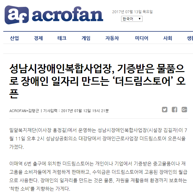 [아크로팬] 성남시장애인복합사업장, 기증받은 물품으로 장애인 일자리 만드는 ‘더드림스토어’ 오픈