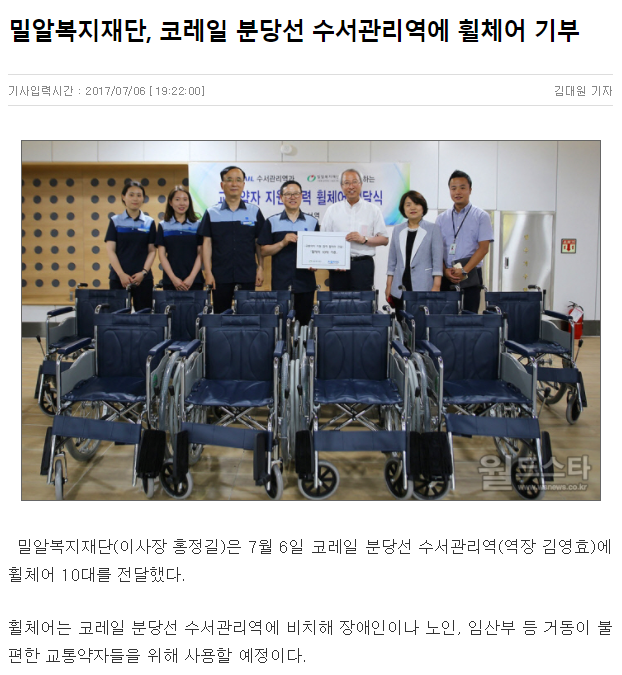 [월드스타] 밀알복지재단, 코레일 분당선 수서관리역에 휠체어 기부