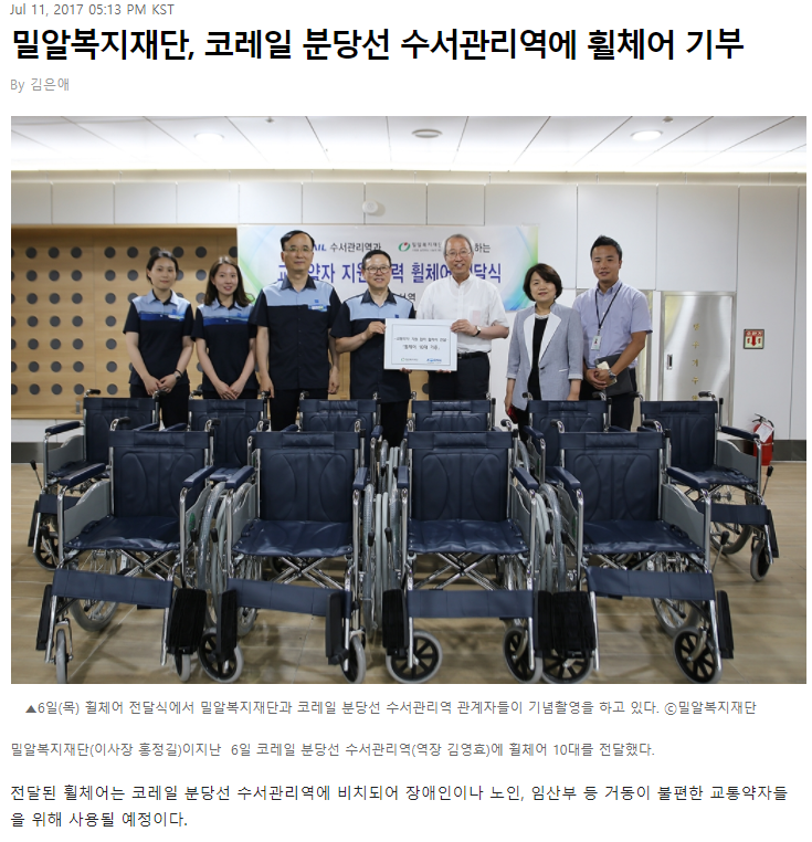 [크리스천투데이] 밀알복지재단, 코레일 분당선 수서관리역에 휠체어 기부