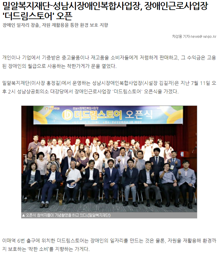 [한국NGO신문] 밀알복지재단-성남시장애인복합사업장, 장애인근로사업장 '더드림스토어' 오픈