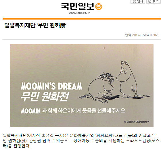 [국민일보] 밀알복지재단 ‘무민 원화展’
