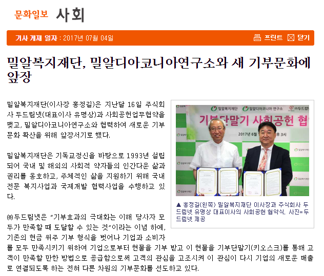 [문화일보] 밀알복지재단, 밀알디아코니아연구소와 새 기부문화에 앞장