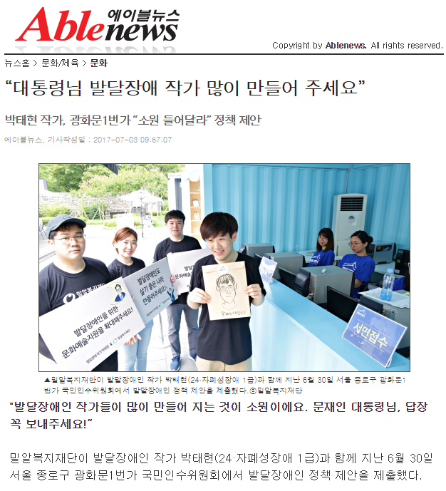 [에이블뉴스] “대통령님 발달장애 작가 많이 만들어 주세요”