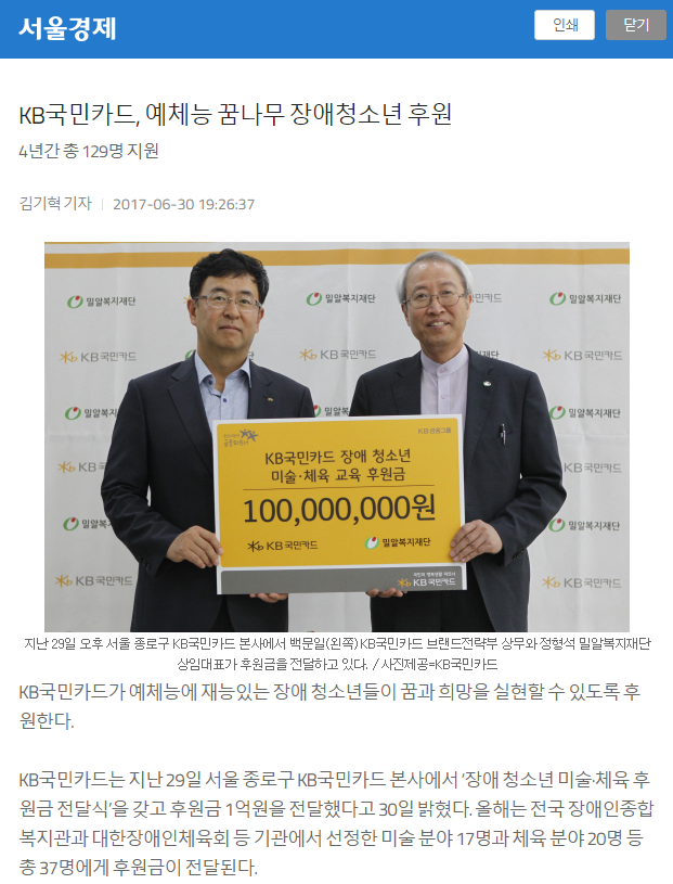 [서울경제] KB국민카드, 예체능 꿈나무 장애청소년 후원