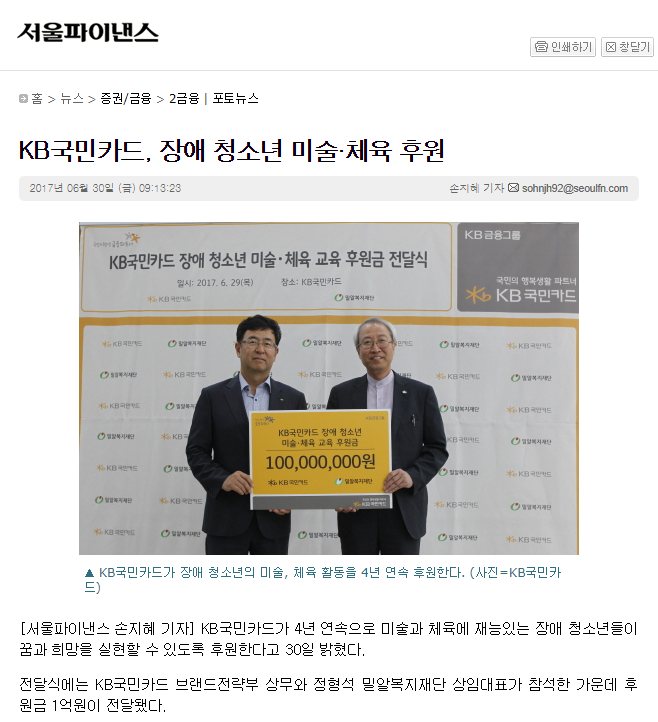[서울파이낸스] KB국민카드, 장애 청소년 미술·체육 후원