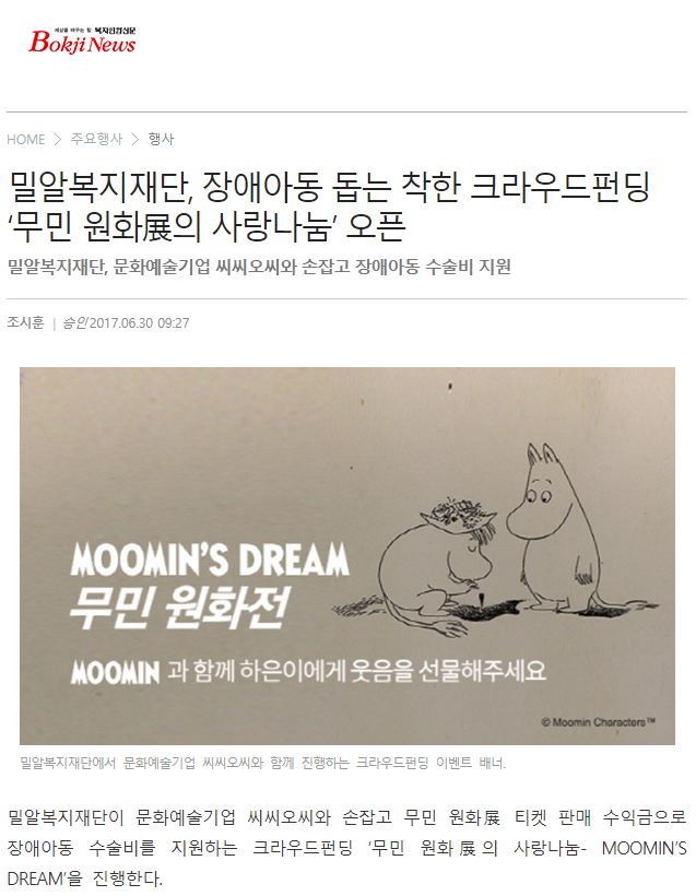 [복지연합신문] 밀알복지재단, 장애아동 돕는 착한 크라우드펀딩 ‘무민 원화展의 사랑나눔’ 오픈