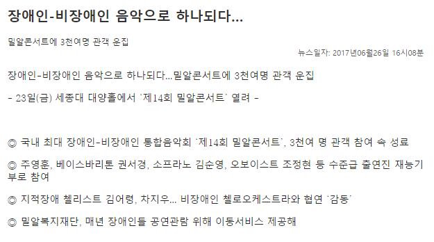 이전 [국민일보] 장애인-비장애인의 앙상블 빛난 밀알콘서트 다음 [컵뉴스] “장애인-비장애인, 음악으로 하나 되다”