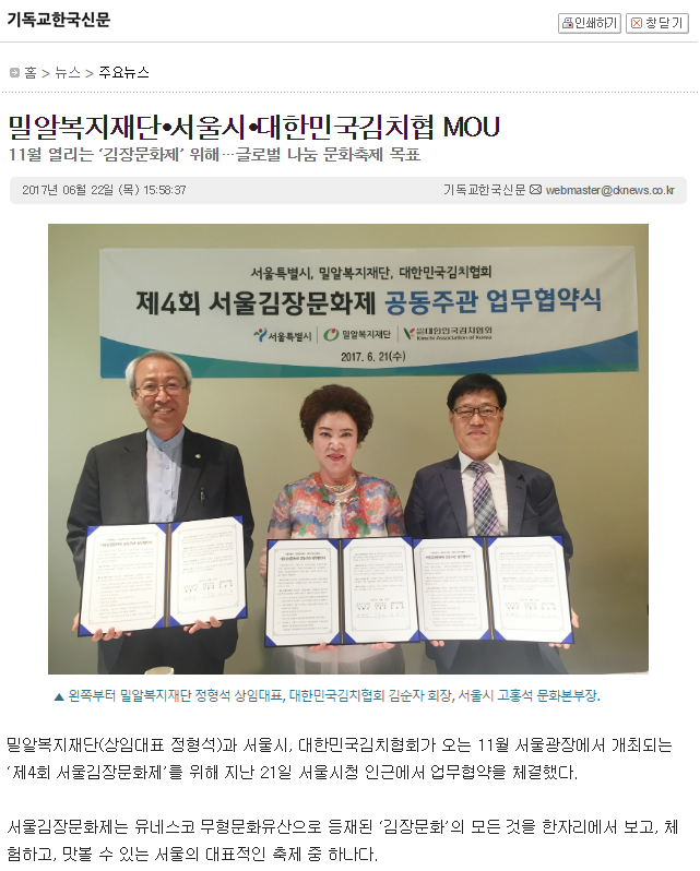 [기독교한국신문] 밀알복지재단, 서울시, 대한민국김치협 MOU