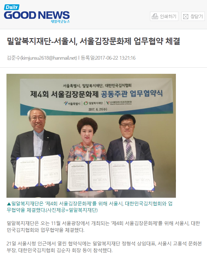 [데일리굿뉴스] 밀알복지재단-서울시, 서울김장문화제 업무협약 체결