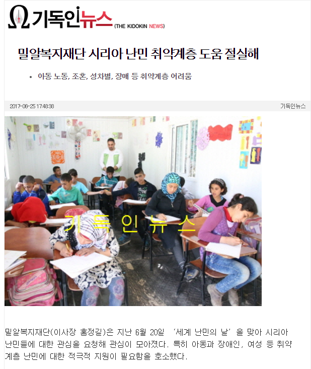 [기독인뉴스] 밀알복지재단 시리아 난민 취약계층 도움 절실해