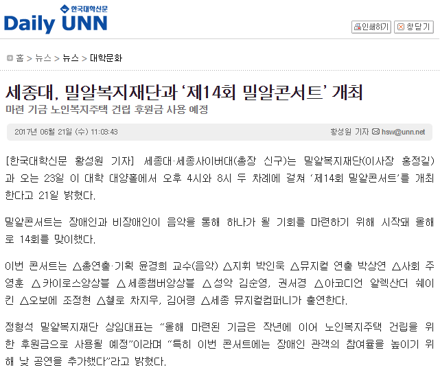 이전 [메트로] 23일 세종대 대양홀서 '밀알콘서트' 공연 다음 [한국경제] 세종대·밀알복지재단, 23일 제14회 밀알콘서트 개최