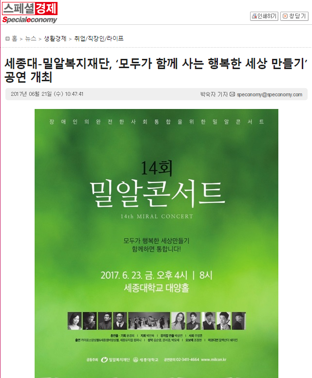 [스폐셜경제] 세종대-밀알복지재단, ‘모두가 함께 사는 행복한 세상 만들기’ 공연 개최