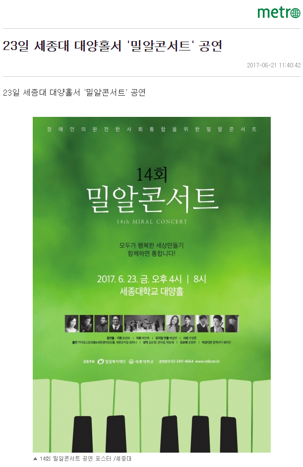 [메트로] 23일 세종대 대양홀서 '밀알콘서트' 공연