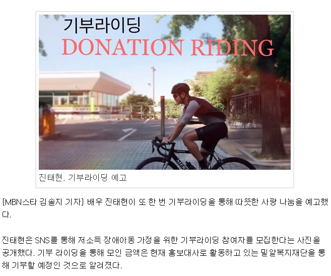 [MBNSTAR] ‘기부천사’ 진태현 “아동 위한 기부 라이딩, 함께 해주세요”