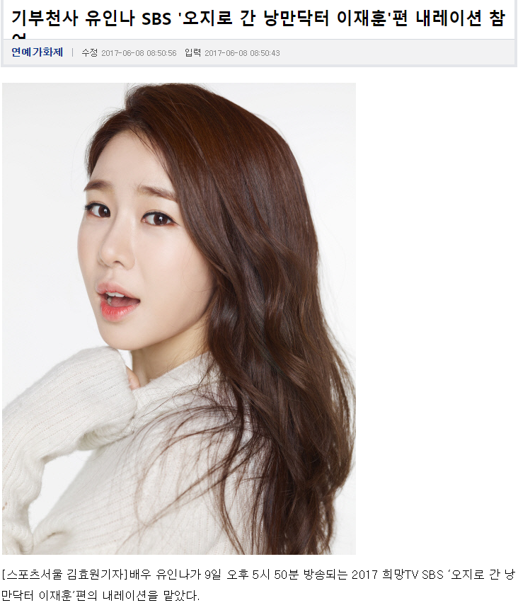 [스포츠서울] 기부천사 유인나 SBS '오지로 간 낭만닥터 이재훈'편 내레이션 참여