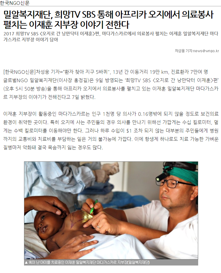 [한국NGO신문] 밀알복지재단, 희망TV SBS 통해 아프리카 오지에서 의료봉사 펼치는 이재훈 지부장 이야기 전한다