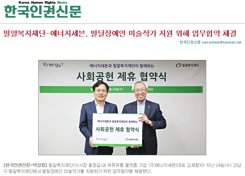 [한국인권신문] 밀알복지재단-에너지세븐, 발달장애인 미술작가 지원 위해 업무협약 체결