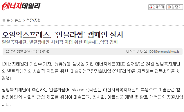 이전 [한국에너지] 오일익스프레스, 밀알복지재단과 인블라썸 캠페인 다음 [에이블뉴스] 발달장애인 미술작가 아트상품 판로지원 '맞손'