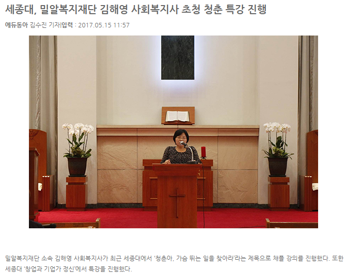 [에듀동아] 세종대, 밀알복지재단 김해영 사회복지사 초청 청춘 특강 진행