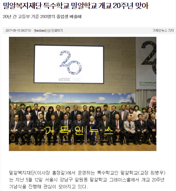 [기독인뉴스] 밀알복지재단 특수학교 밀알학교 개교 20주년 맞아