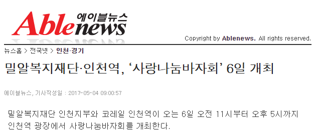 [에이블뉴스] 밀알복지재단·인천역, ‘사랑나눔바자회’ 6일 개최