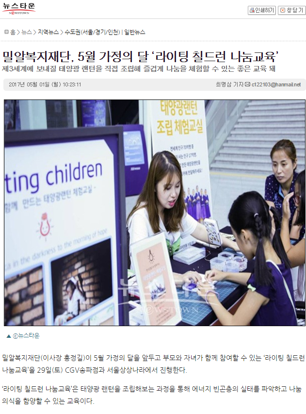 [뉴스타운] 밀알복지재단, 5월 가정의 달 ‘라이팅 칠드런 나눔교육’