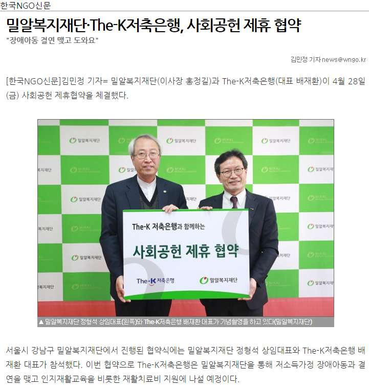 [한국NGO신문] 밀알복지재단·The-K저축은행, 사회공헌 제휴 협약