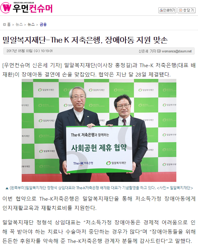 [우먼컨슈머] 밀알복지재단-The K 저축은행, 장애아동 지원 맞손