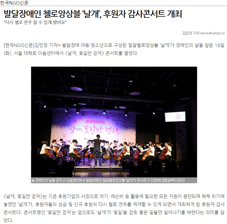 [한국NGO신문] 발달장애인 첼로앙상블 ‘날개’, 후원자 감사콘서트 개최