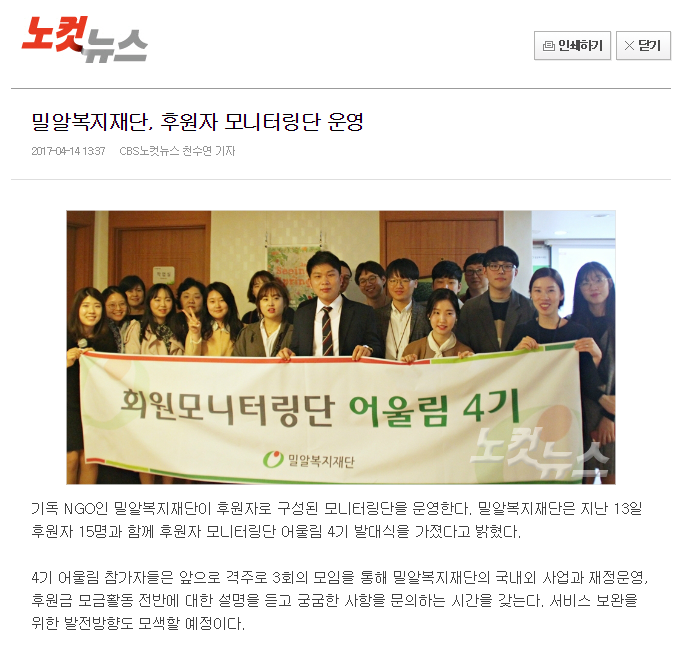 [노컷뉴스] 밀알복지재단, 후원자 모니터링단 운영