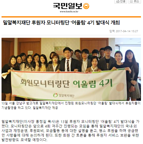 [노컷뉴스] 밀알복지재단, 후원자 모니터링단 운영
