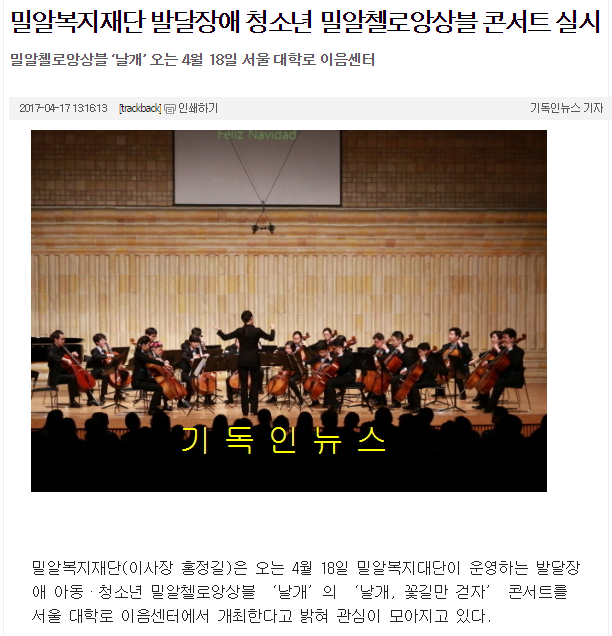 [기독인뉴스] 밀알복지재단 발달장애 청소년 밀알첼로앙상블 콘서트 실시