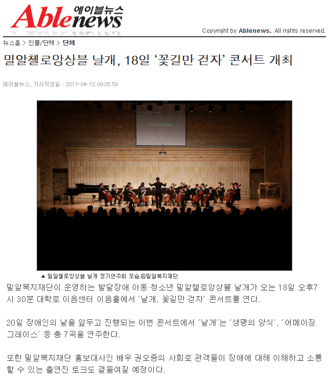 [에이블뉴스] 밀알첼로앙상블 날개, 18일 ‘꽃길만 걷자’ 콘서트 개최