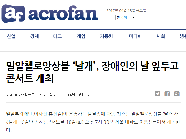 [아크로팬] 밀알첼로앙상블 ‘날개’, 장애인의 날 앞두고 콘서트 개최
