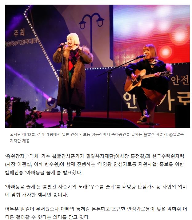 [서울경제] 볼빨간 사춘기, 한국수력원자력 태양광 안심가로등 캠페인…'아빠등을 줄게'