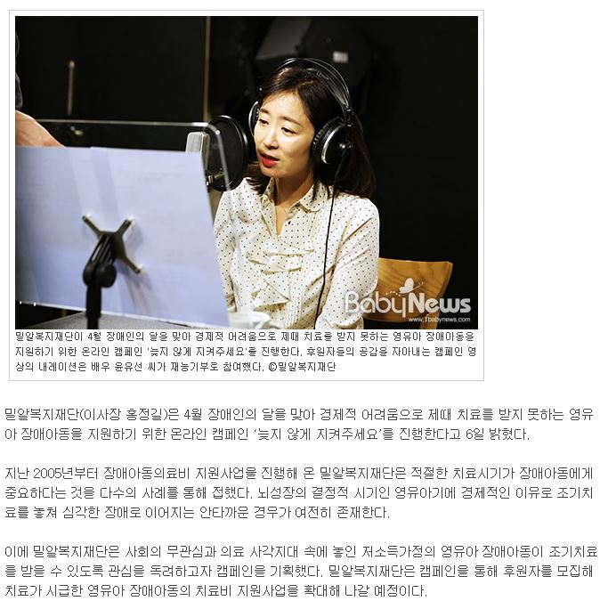 [베이비뉴스] 밀알복지재단, 영유아 장애아동 지원 캠페인 진행