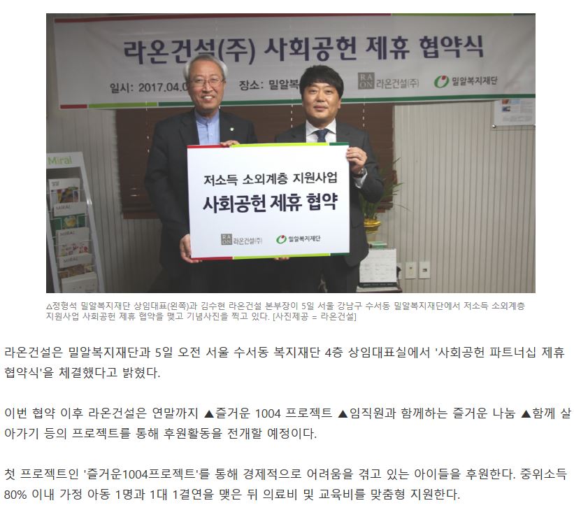 [매일경제] 라온건설-밀알복지재단, 사회공헌 파트너십 제휴 협약 체결