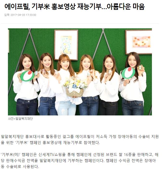 [스포츠동아] 에이프릴, 기부米 홍보영상 재능기부…아름다운 마음