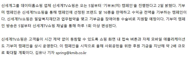 [국민일보] 신세계TV쇼핑, 5일부터 ‘기부米 캠페인’ 진행