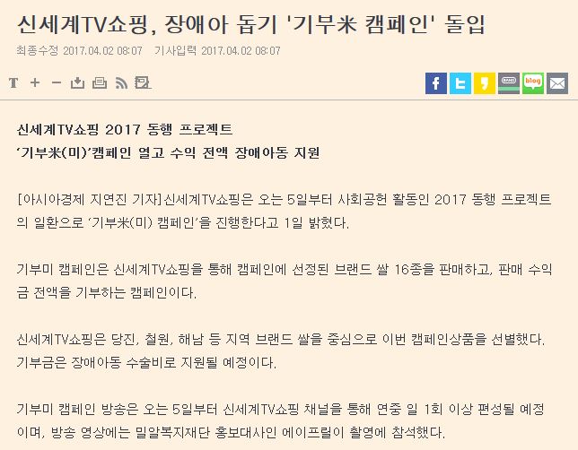 [아시아경제] 신세계TV쇼핑, 장애아 돕기 '기부米 캠페인' 돌입